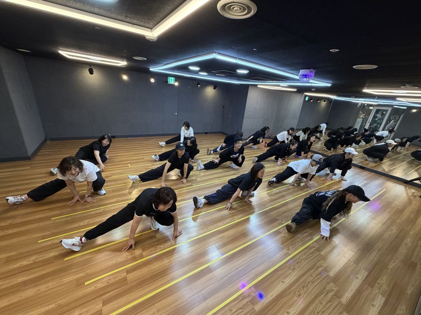 바닥은 충격 흡수 기능이 있는 전문 댄스 마루로 시공되어 있으며, 이는 부상의 위험을